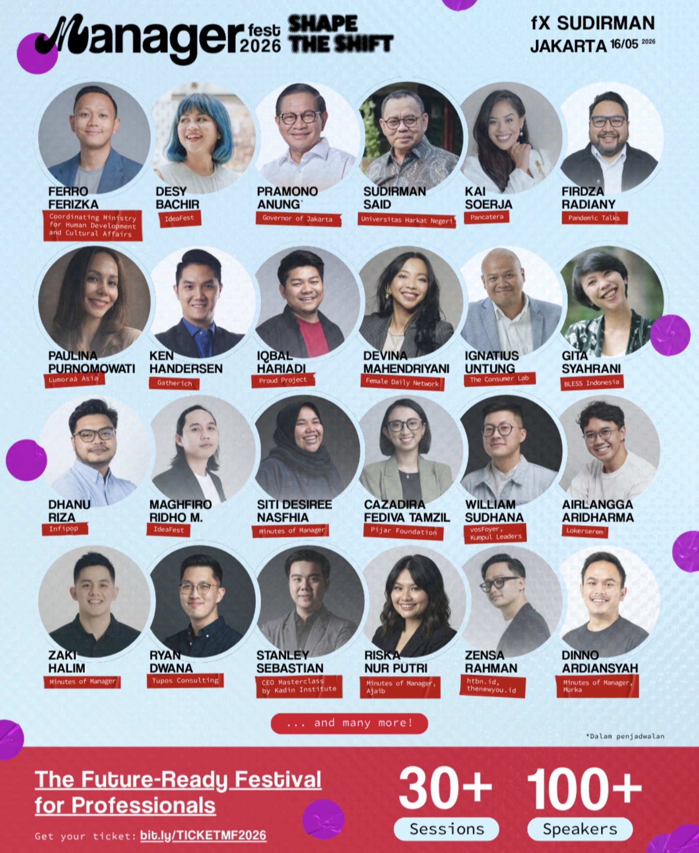 Deretan pembicara yang dijadwalkan hadir meliputi Pramono Anung, Sudirman Said, Kai Soerja, Iqbal Hariadi, Paulina Purnomowati, Dessy Bachir dan masih banyak pembicara Manager Fest 2026 yang masing-masing membawa pengalaman dalam memimpin, membangun, serta menavigasi perubahan di berbagai sektor.
